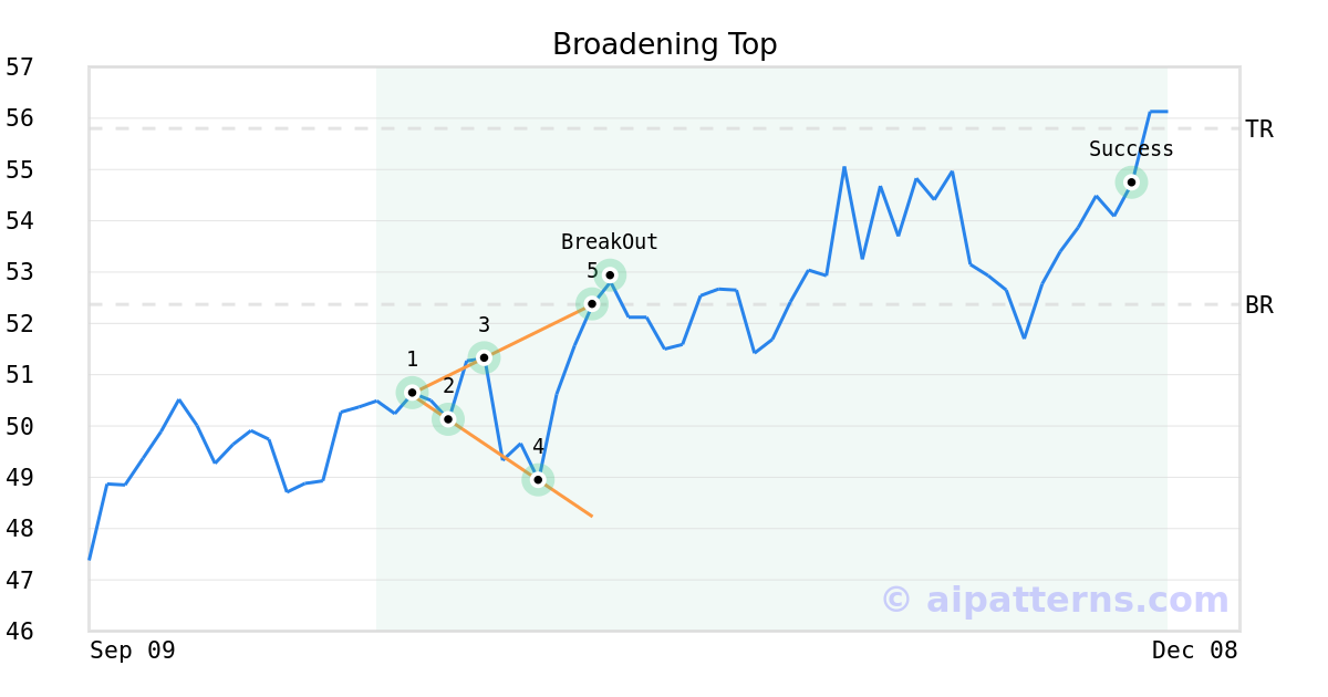 On October 17, 2025, A.I.dvisor detected a Broadening Top Pattern (Bullish) for Shinhan Financial Group Co Ltd (SHG, $52.37). On October 20, 2025, A.I.dvisor confirmed the Bullish pattern, setting a target price of $55.80. 42 days later, on December 01, 2025, SHG reached the target price resulting in a for traders who took a long position in the stock.
