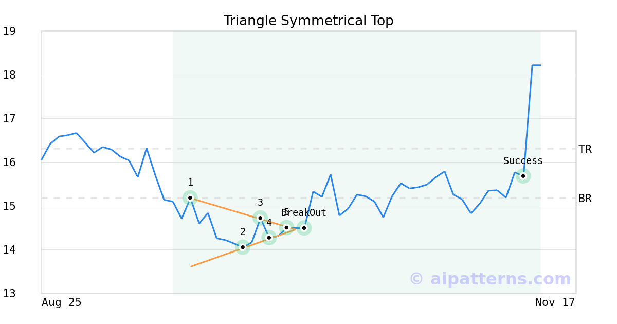 On October 03, 2025, A.I.dvisor detected a Triangle Symmetrical Top Pattern (Bullish) for SI-BONE (SIBN, $14.50). On October 06, 2025, A.I.dvisor confirmed the Bullish pattern, setting a target price of $16.31. 35 days later, on November 10, 2025, SIBN reached the target price resulting in a for traders who took a long position in the stock.