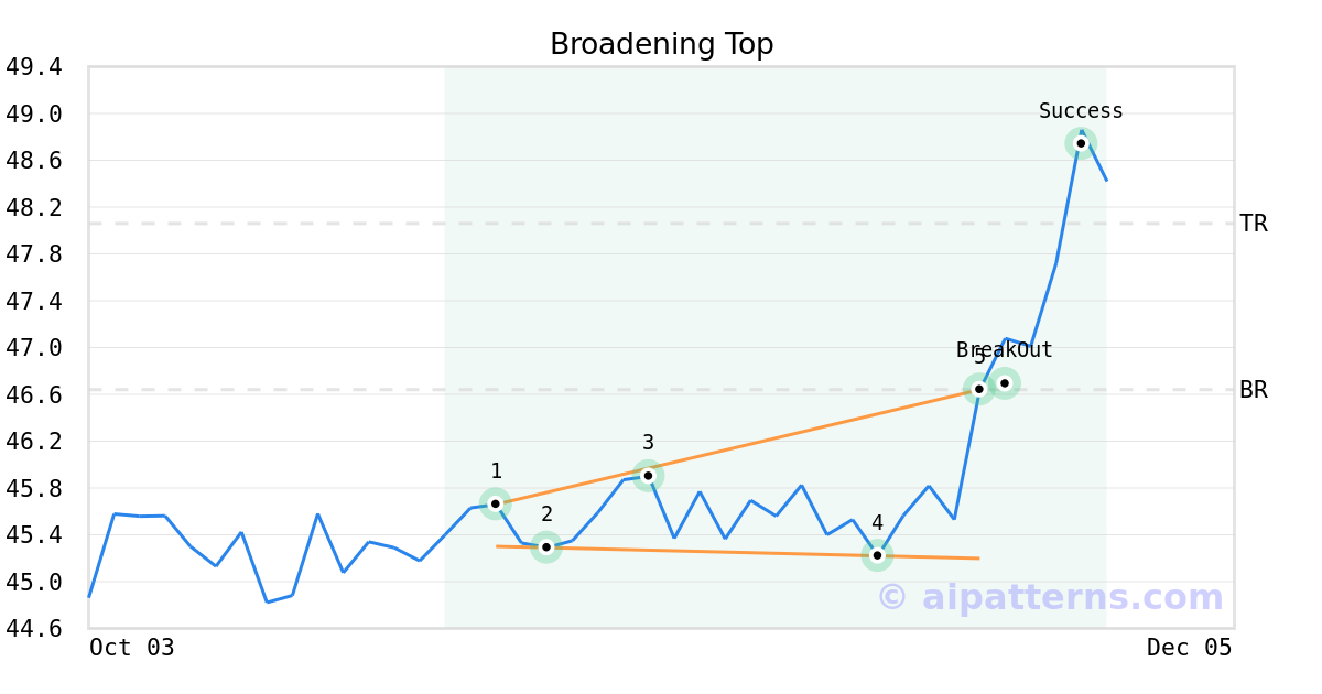 On November 21, 2025, A.I.dvisor detected a Broadening Top Pattern (Bullish) for Source Capital (SOR, $46.64). On November 24, 2025, A.I.dvisor confirmed the Bullish pattern, setting a target price of $48.06. 4 days later, on November 28, 2025, SOR reached the target price resulting in a for traders who took a long position in the stock.