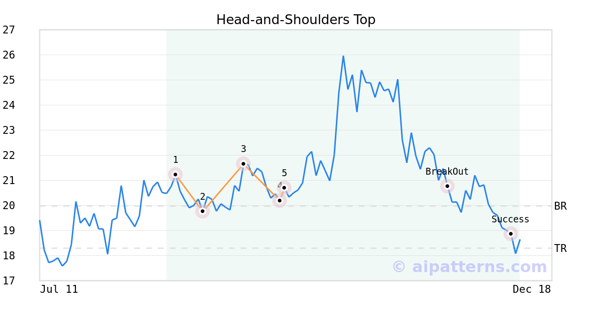 On September 26, 2025, A.I.dvisor detected a Head-and-Shoulders Top Pattern (Bearish) for SHUTTERSTOCK (SSTK, $20.70). 52 days later, on November 17, 2025, A.I.dvisor confirmed the Bearish pattern, setting a target price of the stock. On December 08, 2025, the stock hit the target price of $18.30 – resulting in a gain for traders who shorted the stock on the pattern detection date.