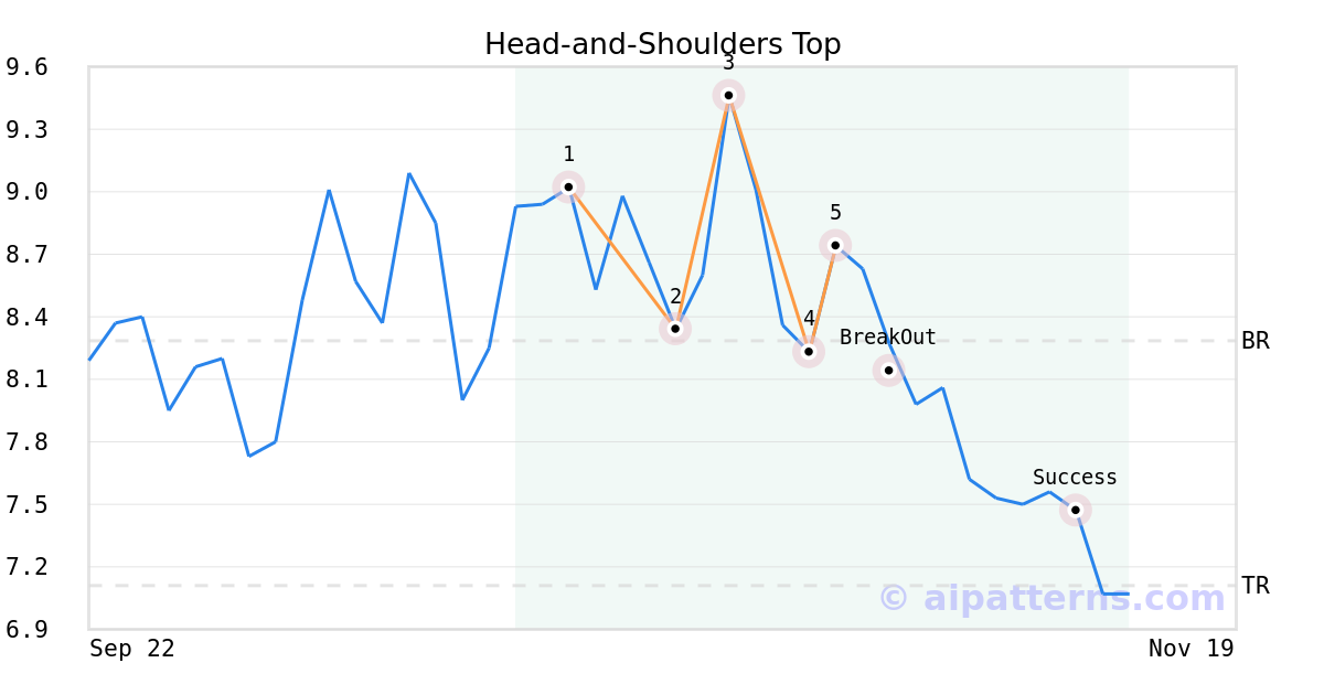 On October 30, 2025, A.I.dvisor detected a Head-and-Shoulders Top Pattern (Bearish) for Teladoc Health (TDOC, $8.74). 4 days later, on November 03, 2025, A.I.dvisor confirmed the Bearish pattern, setting a target price of the stock. On November 12, 2025, the stock hit the target price of $7.11 – resulting in a +1 gain for traders who shorted the stock on the pattern detection date.