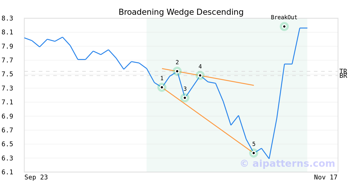 On November 04, 2025, A.I.dvisor detected a Broadening Wedge Descending Pattern (Bullish) for Tredegar Corp (TG, $6.37). On November 10, 2025, A.I.dvisor confirmed the Bullish pattern, setting a target price of $7.54. On November 10, 2025, TG reached the target price resulting in a +2 for traders who took a long position in the stock.