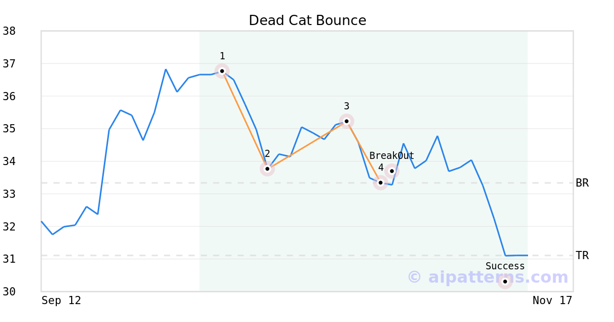 On October 24, 2025, A.I.dvisor detected a Dead Cat Bounce Pattern (Bearish) for TG Therapeutics (TGTX, $33.34). 3 days later, on October 27, 2025, A.I.dvisor confirmed the Bearish pattern, setting a target price of the stock. On November 10, 2025, the stock hit the target price of $31.11 – resulting in a gain for traders who shorted the stock on the pattern detection date.