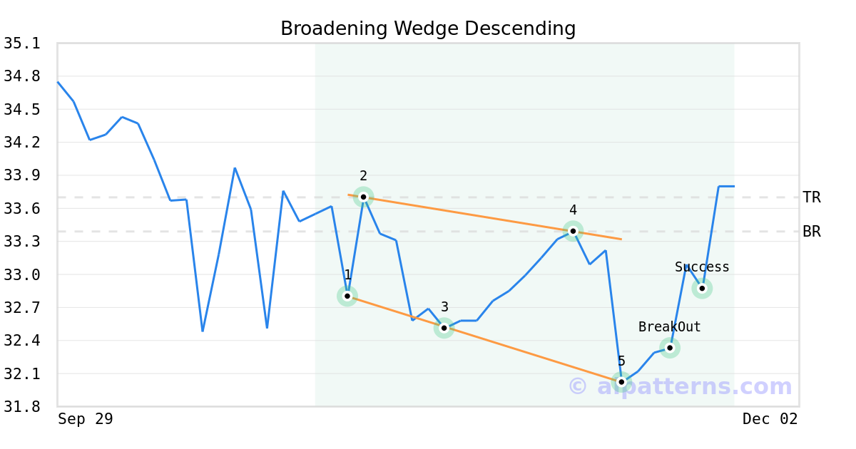 On November 17, 2025, A.I.dvisor detected a Broadening Wedge Descending Pattern (Bullish) for TowneBank (TOWN, $32.02). On November 20, 2025, A.I.dvisor confirmed the Bullish pattern, setting a target price of $33.70. 4 days later, on November 24, 2025, TOWN reached the target price resulting in a for traders who took a long position in the stock.