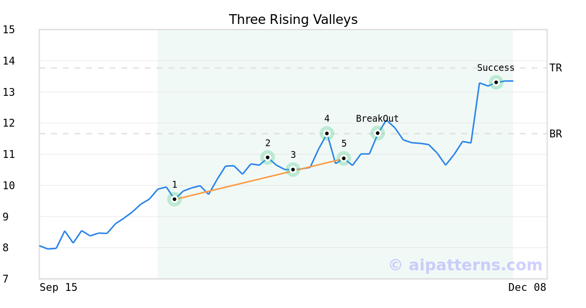 On November 04, 2025, A.I.dvisor detected a Three Rising Valleys Pattern (Bullish) for Trevi Therapeutics (TRVI, $10.86). On November 10, 2025, A.I.dvisor confirmed the Bullish pattern, setting a target price of $13.77. 21 days later, on December 01, 2025, TRVI reached the target price resulting in a +2 for traders who took a long position in the stock.