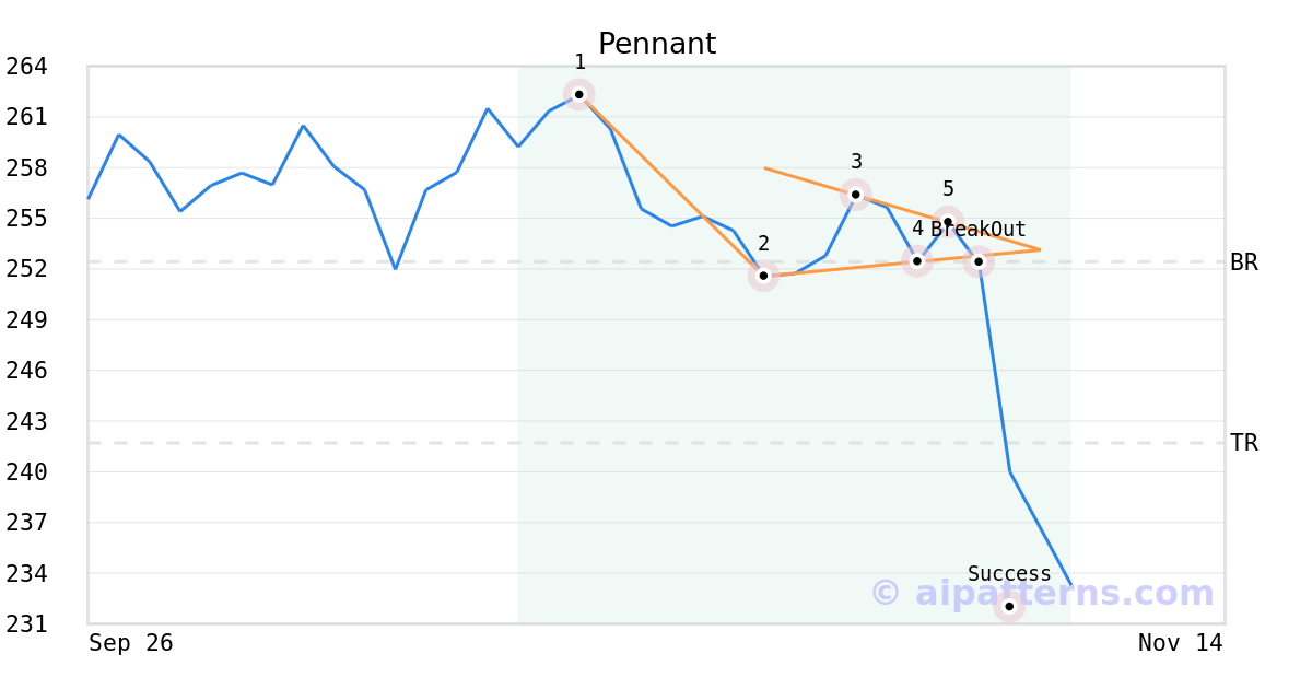 On November 05, 2025, A.I.dvisor detected a Pennant Pattern (Bearish) for Take-Two Interactive Software (TTWO, $254.76). 1 day later, on November 06, 2025, A.I.dvisor confirmed the Bearish pattern, setting a target price of the stock. On November 07, 2025, the stock hit the target price of $241.71 – resulting in a gain for traders who shorted the stock on the pattern detection date.