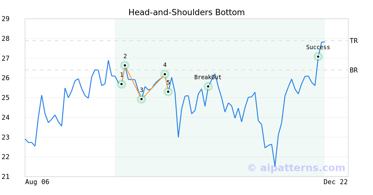 On October 07, 2025, A.I.dvisor detected a Head-and-Shoulders Bottom Pattern (Bullish) for ProShares UltraPro MidCap400 (UMDD, $25.29). On October 23, 2025, A.I.dvisor confirmed the Bullish pattern, setting a target price of $27.89. 48 days later, on December 10, 2025, UMDD reached the target price resulting in a for traders who took a long position in the stock.