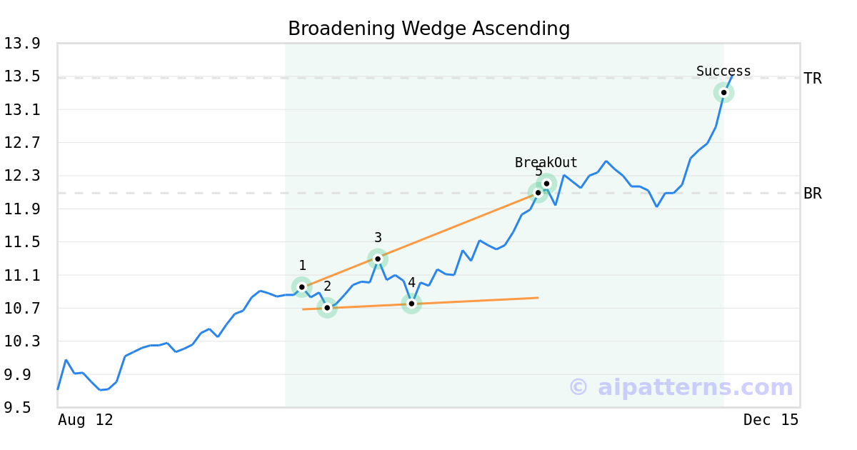 On October 31, 2025, A.I.dvisor detected a Broadening Wedge Ascending Pattern (Bullish) for Vale SA (VALE, $12.09). On November 03, 2025, A.I.dvisor confirmed the Bullish pattern, setting a target price of $13.48. 30 days later, on December 03, 2025, VALE reached the target price resulting in a +1 for traders who took a long position in the stock.