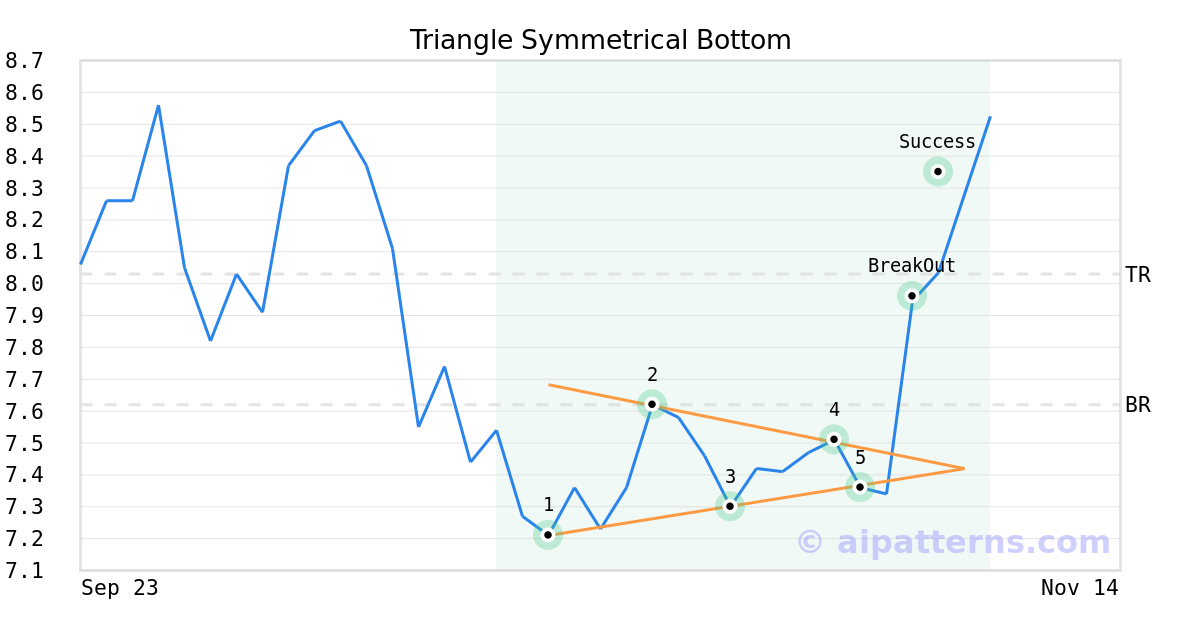 On November 04, 2025, A.I.dvisor detected a Triangle Symmetrical Bottom Pattern (Bullish) for Vermilion Energy (VET, $7.36). On November 06, 2025, A.I.dvisor confirmed the Bullish pattern, setting a target price of $8.03. 1 day later, on November 07, 2025, VET reached the target price resulting in a +1 for traders who took a long position in the stock.