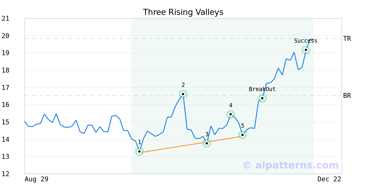 On November 17, 2025, A.I.dvisor detected a Three Rising Valleys Pattern (Bullish) for VF Corp (VFC, $14.25). On November 24, 2025, A.I.dvisor confirmed the Bullish pattern, setting a target price of $19.83. 16 days later, on December 10, 2025, VFC reached the target price resulting in a +3 for traders who took a long position in the stock.