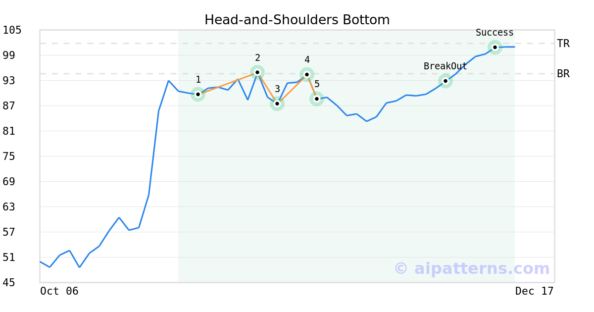 On November 13, 2025, A.I.dvisor detected a Head-and-Shoulders Bottom Pattern (Bullish) for Vicor Corp (VICR, $88.58). On December 03, 2025, A.I.dvisor confirmed the Bullish pattern, setting a target price of $101.80. 7 days later, on December 10, 2025, VICR reached the target price resulting in a +1 for traders who took a long position in the stock.