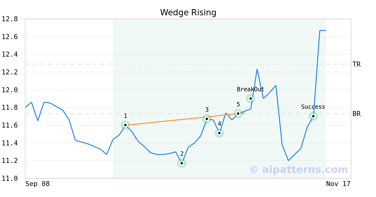 On October 24, 2025, A.I.dvisor detected a Wedge Rising Pattern (Bullish) for Vodafone Group Plc (VOD, $11.73). On October 27, 2025, A.I.dvisor confirmed the Bullish pattern, setting a target price of $12.29. 14 days later, on November 10, 2025, VOD reached the target price resulting in a for traders who took a long position in the stock.