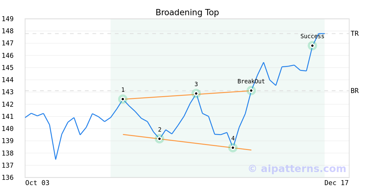 On November 25, 2025, A.I.dvisor detected a Broadening Top Pattern (Bullish) for Vanguard High Dividend Yield ETF (VYM, $143.11). On November 25, 2025, A.I.dvisor confirmed the Bullish pattern, setting a target price of $147.79. 15 days later, on December 10, 2025, VYM reached the target price resulting in a for traders who took a long position in the stock.