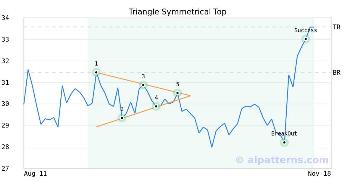 On October 01, 2025, A.I.dvisor detected a Triangle Symmetrical Top Pattern (Bullish) for Weyco Group (WEYS, $30.50). On November 04, 2025, A.I.dvisor confirmed the Bullish pattern, setting a target price of $33.58. 7 days later, on November 11, 2025, WEYS reached the target price resulting in a for traders who took a long position in the stock.