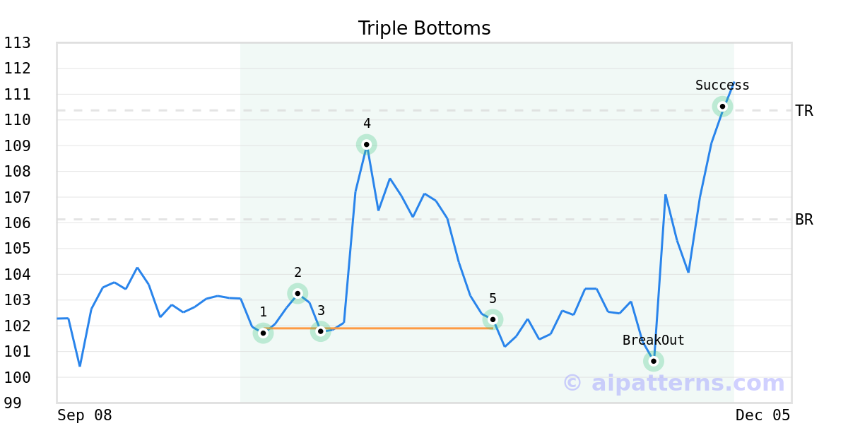 On October 30, 2025, A.I.dvisor detected a Triple Bottoms Pattern (Bullish) for Walmart (WMT, $102.23). On November 19, 2025, A.I.dvisor confirmed the Bullish pattern, setting a target price of $110.37. 9 days later, on November 28, 2025, WMT reached the target price resulting in a for traders who took a long position in the stock.