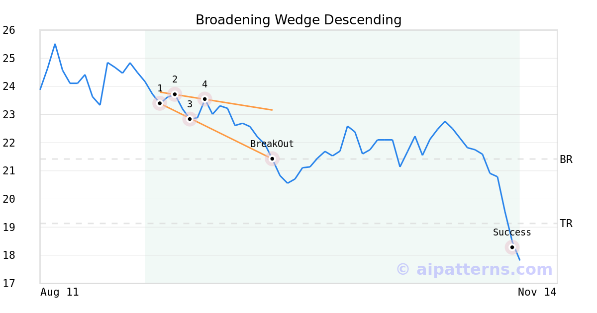 On September 24, 2025, A.I.dvisor detected a Broadening Wedge Descending Pattern (Bearish) for WillScot Holdings Corporation (WSC, $21.42). On September 24, 2025, A.I.dvisor confirmed the Bearish pattern, setting a target price of the stock. On November 07, 2025, the stock hit the target price of $19.13 – resulting in a +1 gain for traders who shorted the stock on the pattern detection date.