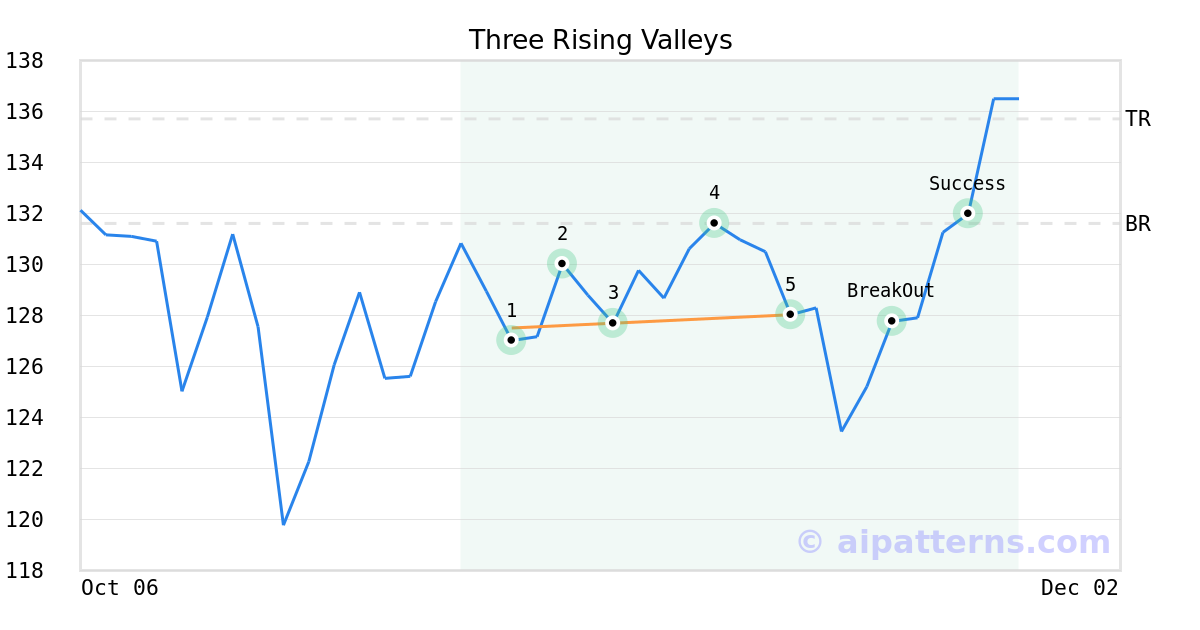 On November 13, 2025, A.I.dvisor detected a Three Rising Valleys Pattern (Bullish) for Wintrust Financial Corp (WTFC, $128.03). On November 19, 2025, A.I.dvisor confirmed the Bullish pattern, setting a target price of $135.71. 5 days later, on November 24, 2025, WTFC reached the target price resulting in a for traders who took a long position in the stock.
