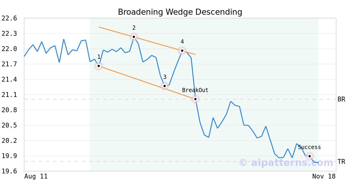 On October 06, 2025, A.I.dvisor detected a Broadening Wedge Descending Pattern (Bearish) for ProShares Ultra Yen (YCL, $21.01). On October 06, 2025, A.I.dvisor confirmed the Bearish pattern, setting a target price of the stock. On November 11, 2025, the stock hit the target price of $19.79 – resulting in a gain for traders who shorted the stock on the pattern detection date.
