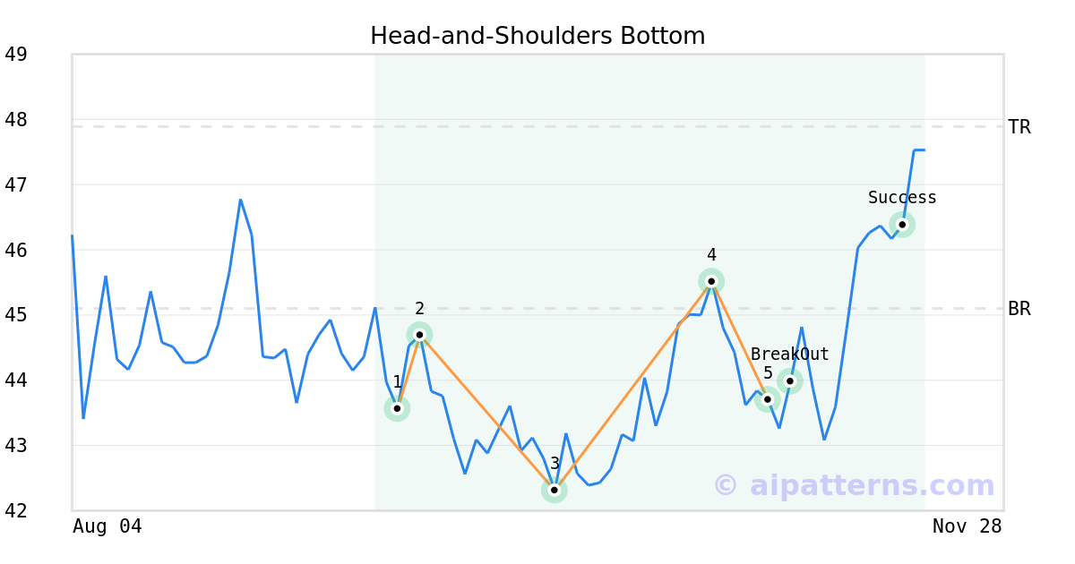 On October 30, 2025, A.I.dvisor detected a Head-and-Shoulders Bottom Pattern (Bullish) for Yum China Holdings (YUMC, $43.70). On November 03, 2025, A.I.dvisor confirmed the Bullish pattern, setting a target price of $47.89. 14 days later, on November 17, 2025, YUMC reached the target price resulting in a for traders who took a long position in the stock.